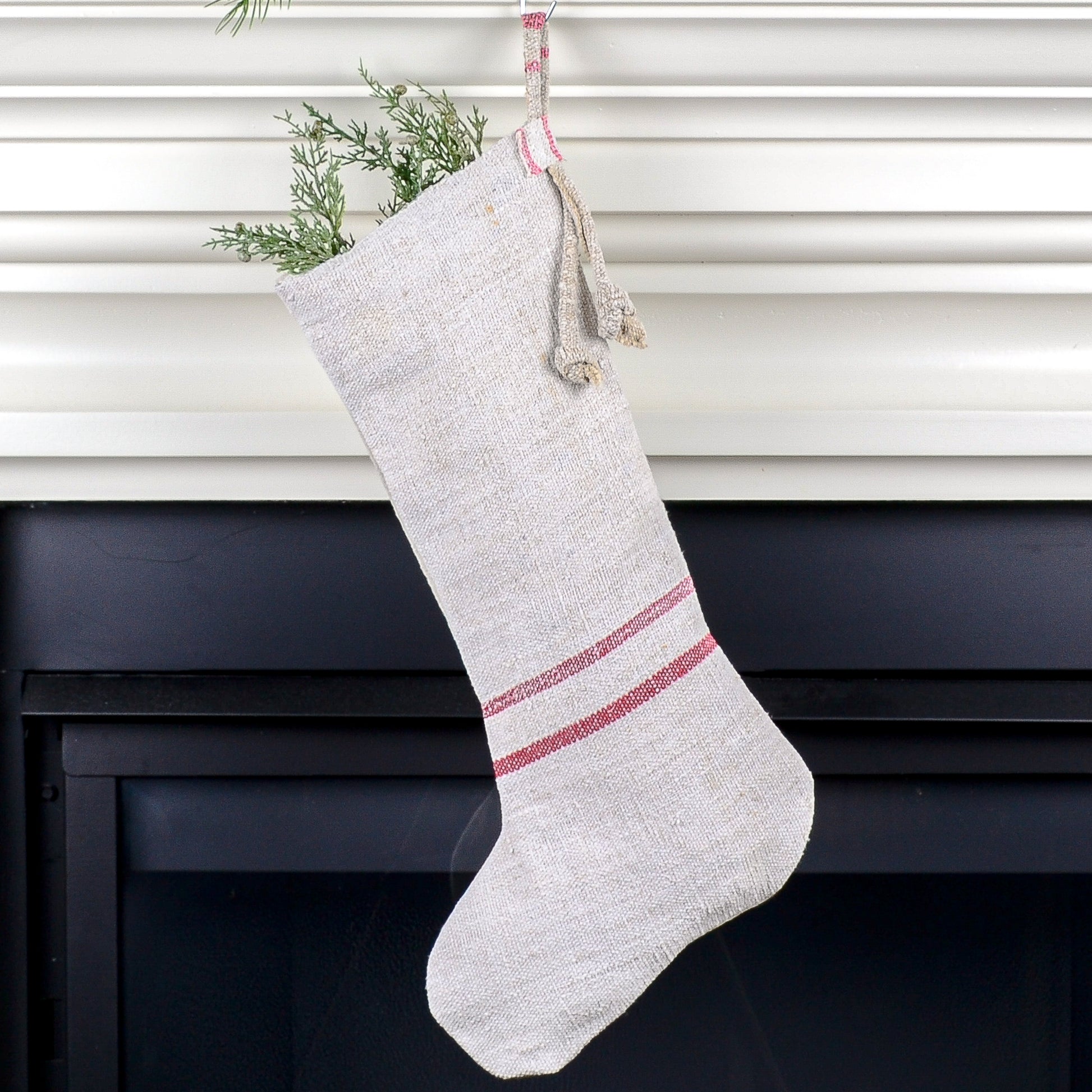 This grain sack stocking made from antique European linen will be a delightful addition to your modern/country/farmhouse Christmas holiday decor.